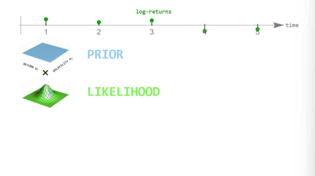 Next, we introduce the regime-switching model that we will use to derive the probabilistic Sharpe ratio. We use a hierarchical modeling approach similar to stochastic volatility models in which we describe weekly log-returns as normally distributed values, but both the mean and standard deviation of this Normal distribution are allowed to change over time. To infer the time-varying expected return (the mean of the Normal distribution) and the time-varying volatility (the standard deviation of the Normal distribution) from the short series of returns that we will look at in this example, we use the probabilistic programming framework bayesloop. In probabilistic programming, variables represent random variables that are connected to each other via code, building complex hierarchical models that can then be fitted to data. The Python package bayesloop is a specialized framework that describes times series by a simple likelihood such as a Normal distribution, a Poisson distribution, etc…, but allows the parameters of this likelihood to change over time in different ways.