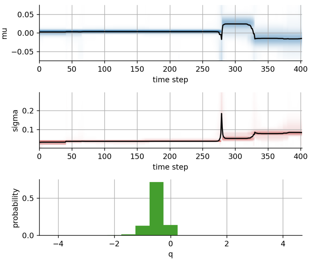 Figure 5: Inferred parameter distributions based on the regime-switching model. The temporal evolution of the expected return mu is displayed in the top panel, the black line indicates the posterior mean value, the shading indicates the uncertainty of the parameter estimate. The temporal evolution of volatility sigma is displayed in the center panel. The bottom panel shows the distribution of the hyper-parameter q, which indicates the likeliness of abrupt parameter jumps.