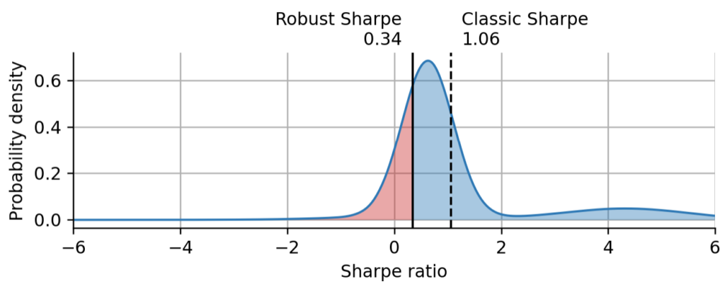Above, we have plotted the Sharpe distribution that we have obtained from the probabilistic regime-switching model, together with the robust Sharpe and the classic Sharpe point estimates. The red shading shows the probability density of the left tail corresponding to our chosen confidence level. We can learn quite a few things from this graph: Even with ~8 years of historical weekly returns, the Sharpe distribution is still very broad, especially since we accounted for regime switches. The Sharpe distribution is not a unimodal bell-shaped distribution, but rather shows a superposition of peaks that correspond to the different regimes/combinations of expected return and volatility. The height of the peaks reflects the fraction of time that the asset has spent in the corresponding regime. As expected, the robust Sharpe is more conservative than the classic Sharpe and at the confidence level of 75%, we cannot assume that ARKK even has a positive Sharpe.