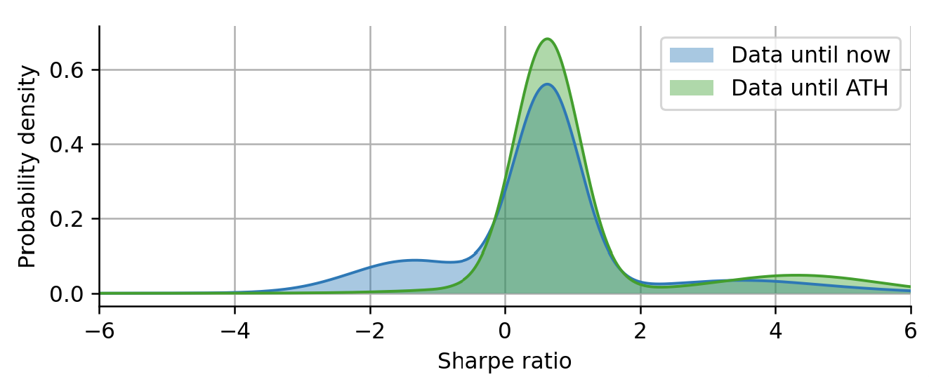 If we directly compare the two Sharpe distributions, the one considering all data, and the one considering the data only up to the all-time high, we can see that the most probable Share value does not change at all, because it is determined by the earliest regime of ARKK that started with its inception. However, we can see that the regime corresponding to the recent decline is still missing and the right tail is thicker because the data is perfectly timed at the all-time high.