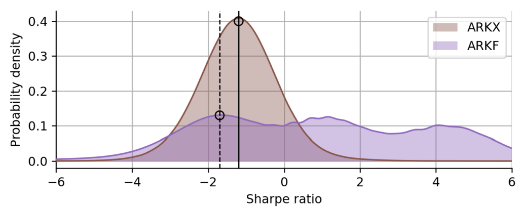 The first thing we notice is that the robust Sharpe ratio on the y-axis is always below the classic Sharpe ratio on the x-axis (below the red identity line), as expected, because we choose a conservative confidence level of 75% as before. We also notice that two ETFs attain a much lower robust Sharpe ratio than the others. ARKF and ARKX were issued only in 2019 and 2021, respectively, and this shorter track record is penalized by the robust Sharpe estimate. The difference is best visible in ARKF, which attains a classic Sharpe near zero, still fairly close to the leading group of four, but regarding the robust Sharpe ratio, it is far behind. It is curious, though, that the robust Sharpe values of the two are closer together than their classic Sharpe values. Let us have a closer look at their Sharpe distributions to understand this.
