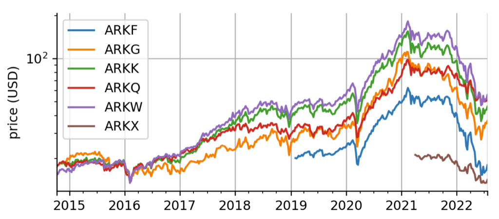 Figure 1: Historical data. Historical weekly, adjusted close prices of the 6 original ARK funds. The y-axis is logarithmically scaled for better comparison.