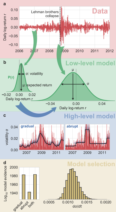 Figure 3: Schematic illustration of the hierarchical modeling approach. Time series data (a) is locally described by a probability distribution with a set of parameters, the low-level model (b). These parameters are allowed to change over longer time scales according to one or more transformations, the high-level models (c). Different hypotheses about the high-level models (i.e. different types of parameter dynamics) can be tested by computing the Bayesian model evidence (d).