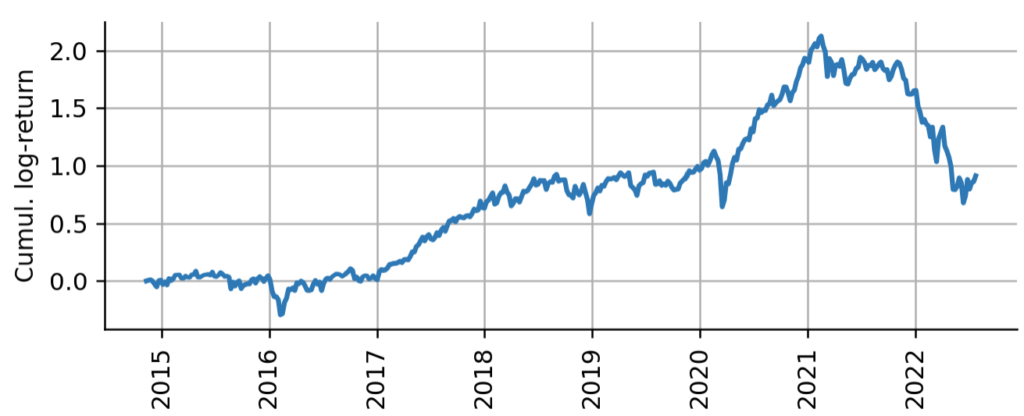 Figure 4: Cumulative log-returns of ARKK. Cumulative weekly log-returns indicate the profit-and-loss one would attain from buying and holding ARKK from its inception, on a logarithmic scale.