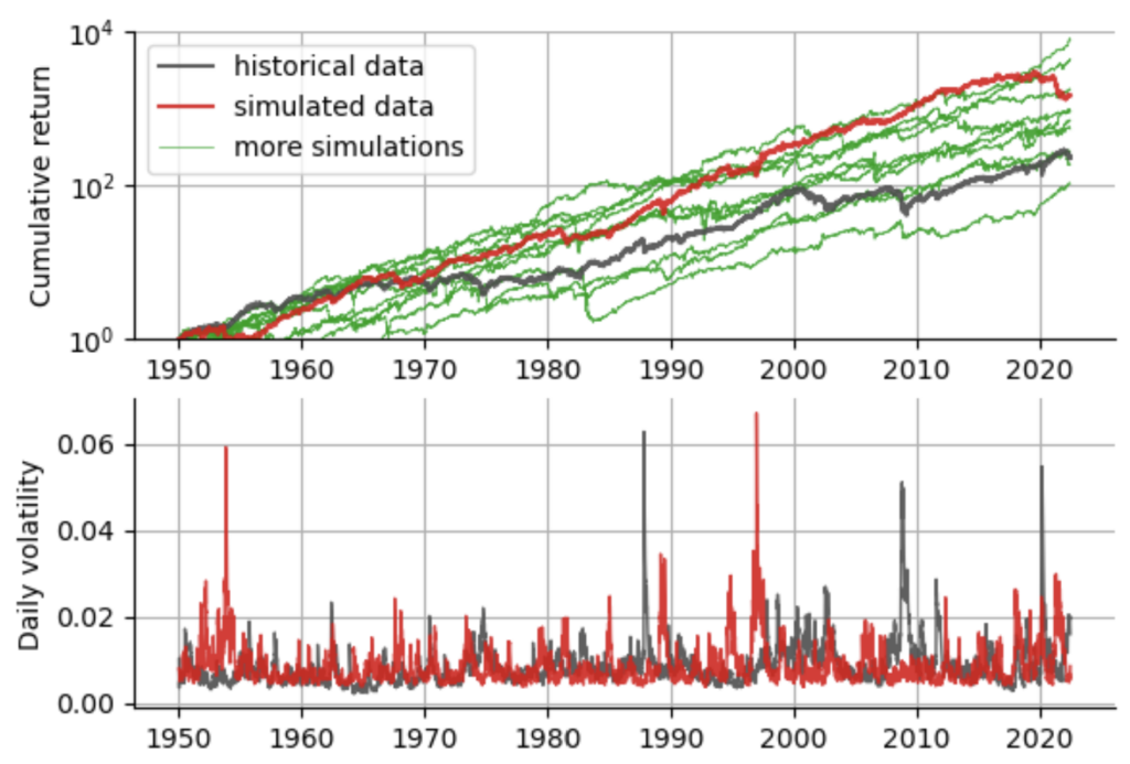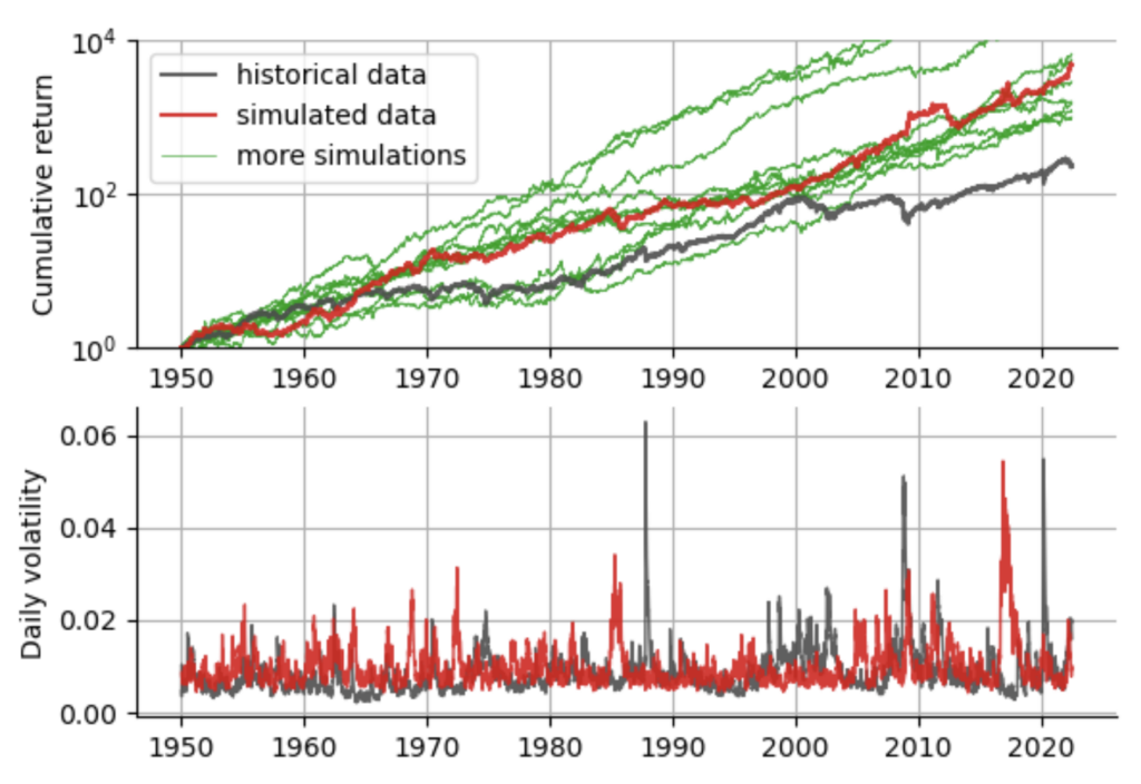 Looking at the simulated data vs. the real historical data, we can learn a few things: the GARCH(1,1) does a pretty good job in modeling volatility spikes, regarding the frequency and magnitude of the spikes and it produces realistic looking equity curves with crashes and rallies. We further notice that all simulations attain a larger cumulative return compared to the real S&P500. The main reason for this overly good performance is that the GARCH(1,1) model as defined here does not allow for asymmetry, whereas it is known that the negative tail of the real return distribution shows more extreme values than the positive tail.