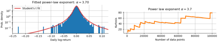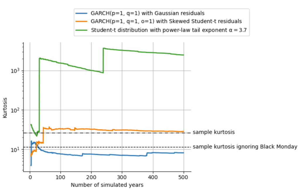 The asymmetric GARCH process can account for the heavier left tail of the return distribution and thus nicely replicates the sample kurtosis of the data. However, both of these GARCH processes fall into the trap of infinite moments: they replicate the finite sample kurtosis when in reality, kurtosis is infinite. In the plot above, we also show the sample kurtosis of a Student-t distribution with the power-law tail exponent of as we have fitted earlier in this lecture. As we can see, the sample kurtosis of the power-law model does not stabilize, but rather climbs higher and higher, up to ~100 times the sample kurtosis of the data within the 500 years that we simulate, clearly indicating that the true value of kurtosis is infinity.